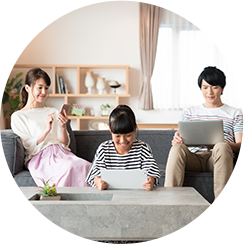 データ容量無制限・最大66台まで同時接続OKなので、家族皆でhome5Gをご利用可能。複雑な設定も要らないので、パソコンやスマホに疎いご家族の方でも、簡単にWi-Fiをお使いいただけます!