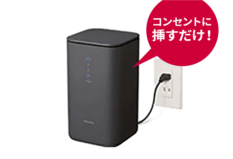 工事不要・スタッフ等との対面なしでご契約可能。本体お届け後、コンセントに挿すだけでWi-Fi環境が整います。工事の必要がないので、スケジュールを空けておく必要もありません。ホームルーター本体が届けば、即日利用を開始することができます。